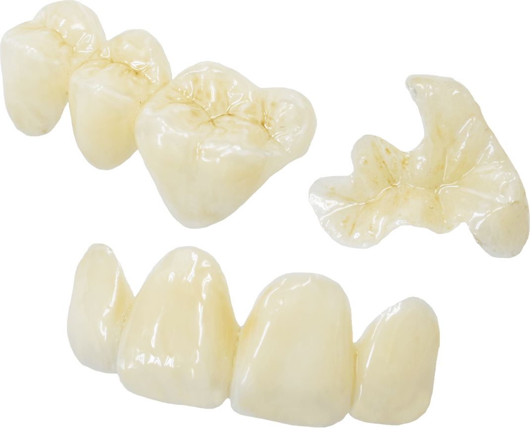 スーパーエンジニアリングプラスチックを初めて歯冠材料として厚生省の薬事認証を取得しました。破折不安の解消、歯質に優しい粘弾性材料、高精度な適合性と高い耐久性などを特徴とし、口腔内から可及的に金属を使用することなく、インレーからクラウンブリッジまでを補綴製作するプロセスを実現させました。